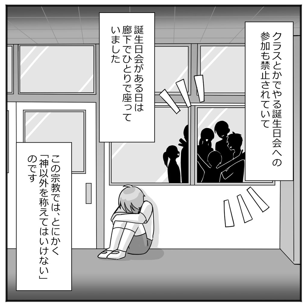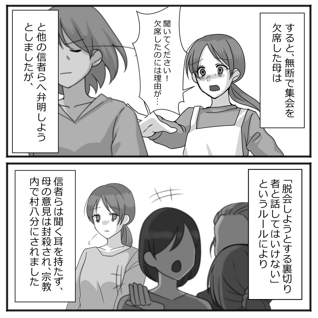 前半の集会や体罰の下り読んだらエホバかな?と思いましたが村八分とか落書きらへんで違うなと思いました