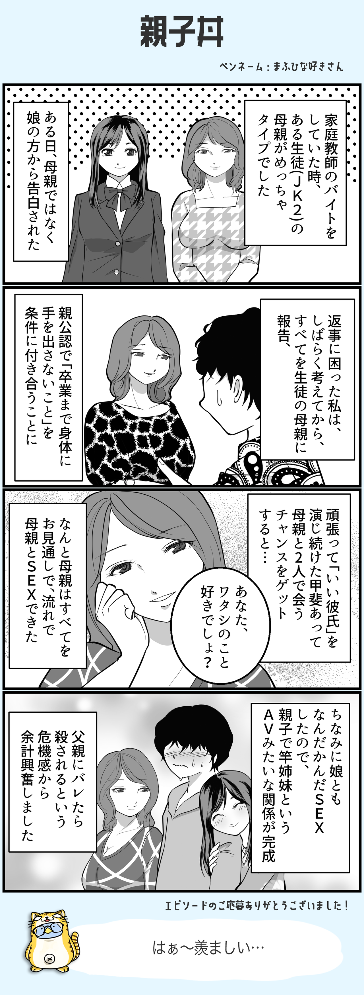 親子丼 #Twitterでしかできない話 2022/10/18 漫画制作:ハニメメオさん(Twitter) < 前の記事次の記事 > コメント コメント一覧 (2) 1. 無職 2022/10/22 15:29 妥協案として娘と付き合うの気持ちェ〜 0 滝沢ガレソ がしました 2. 名無しの某 2022/11/04 13:37 単に、母・娘とやっただけでは? 一緒にヤってこそ親娘丼。まぁエクスタシー等を使えばキメセクも可能だけど。 0 滝沢ガレソ がしました コメントフォーム 名前 コメント 記事の評価 リセット リセット 顔 星 情報を記憶 コメントを投稿する