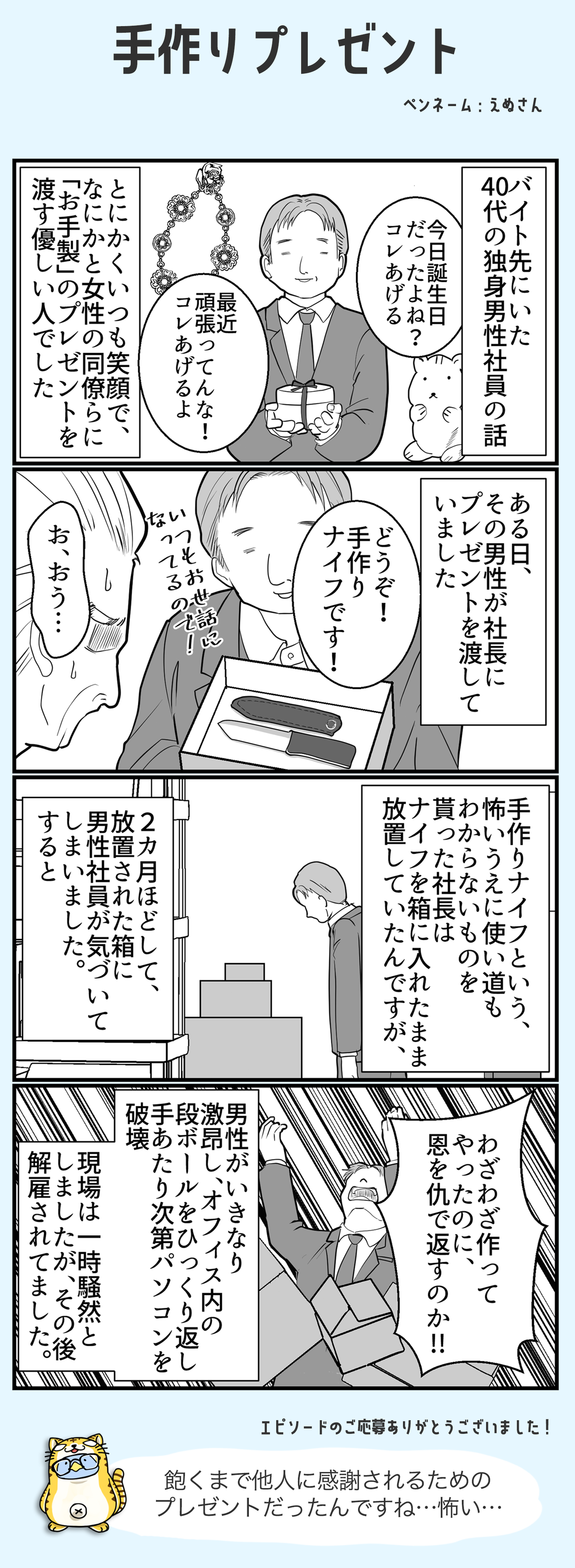 手作りプレゼント #Twitterでしかできない話 2023/03/21 漫画制作:ハニメメオさん(Twitter) < 前の記事次の記事 > コメント コメント一覧 (1) 1. 名無し 2023/10/06 06:48 ナイフを贈る→縁を切る由来がある事を聞いて、当てはまるなと思った 0 滝沢ガレソ がしました コメントフォーム 名前 コメント 記事の評価 リセット リセット 顔 星 情報を記憶 コメントを投稿する