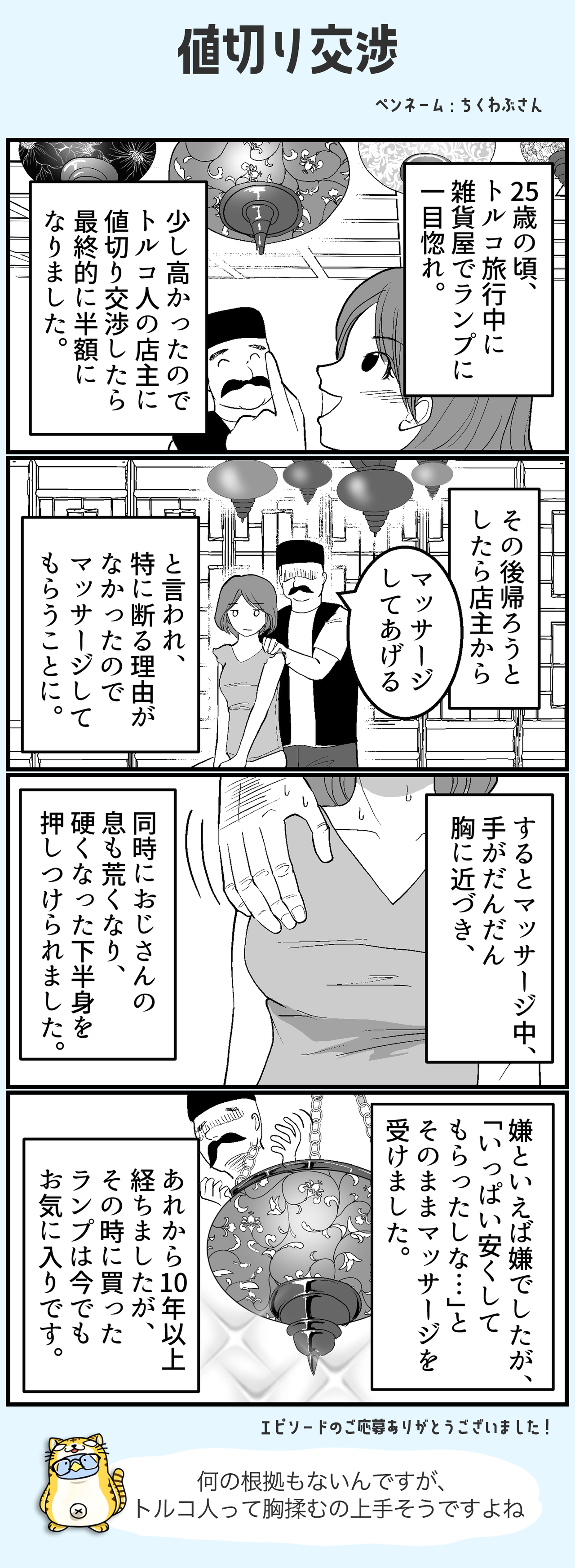 値切り交渉 #Twitterでしかできない話 2023/03/17 漫画制作:ハニメメオさん(Twitter) < 前の記事次の記事 > コメント コメント一覧 (3) 2. GG 2023/03/21 07:10 これって海外旅行で良く聞く話しだけど、何故店先でマッサージ受けるかな。不思議で仕方ない 0 滝沢ガレソ がしました 3. 通りすがり 2023/03/25 09:10 イスラム圏では女性に飢えてるので外国人女性へのセクハラは横行。かつ日本人はだんまりなのでカモ。 彼らにとってイスラムの教義は外国人には適用されないとか言い訳してる。 0 滝沢ガレソ がしました 4. ななし 2023/04/03 13:24 多分半額以下の価値だと思うが 0 滝沢ガレソ がしました コメントフォーム 名前 コメント 記事の評価 リセット リセット 顔 星 情報を記憶 コメントを投稿する