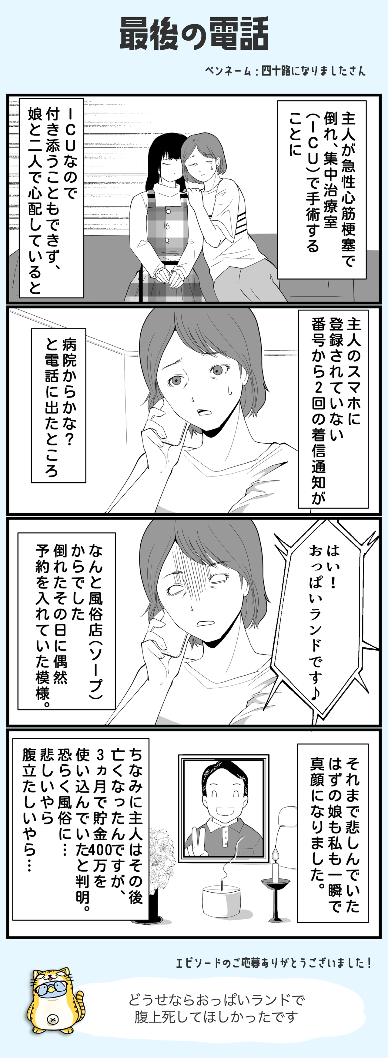最後の電話 #Twitterでしかできない話 2023/09/04 漫画制作:ハニメメオさん(Twitter) < 前の記事次の記事 > コメント コメント一覧 (1) 1. がれそ 2023/09/06 09:59 ICUで手術せんやろ 0 滝沢ガレソ がしました コメントフォーム 名前 コメント 記事の評価 リセット リセット 顔 星 情報を記憶 コメントを投稿する