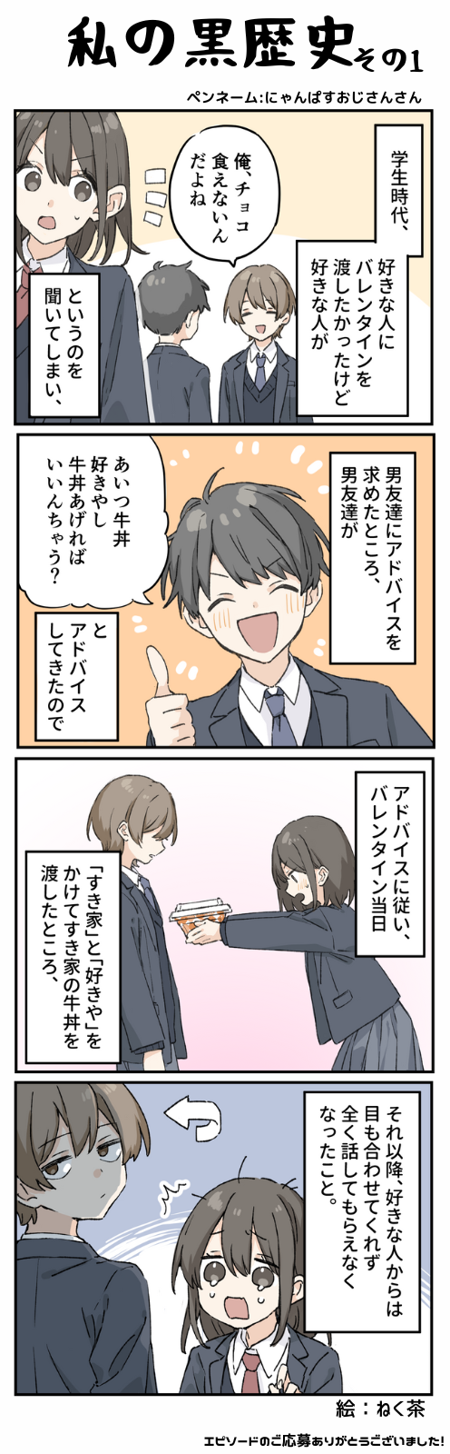 私の黒歴史 その1 2024/07/16 漫画制作:ねく茶 < 前の記事次の記事 > コメント コメント一覧 (13) 1. 2024/07/16 13:03 すげぇ可哀想じゃあどうすりゃ良かったんや 0 滝沢ガレソ がしました 10. 2024/07/17 01:16 >>1 アレルギー持ちとか鼻血すぐ出るとか言ってなけりゃただの牽制だからチョコでいいんだよ… 牛丼とか「コイツやべえ…」で全力で警戒されれて当然じゃww 0 滝沢ガレソ がしました 2. s 2024/07/16 13:10 発達の方早く完結してくれ 0 滝沢ガレソ がしました 3. 2024/07/16 14:23 新連載は発達ワイを畳んでからにしてくれ 0 滝沢ガレソ がしました 4. アイウエオかきくけこさしすせそ 2024/07/16 14:28 シンプルに草 0 滝沢ガレソ がしました 5. あ 2024/07/16 15:03 稼ぎ頭の発達を終わらせたくないから、露骨な牛歩戦術に出たな。 0 滝沢ガレソ がしました 11. あ 2024/07/17 02:32 >>5 また別の発達を見繕ってくれば宜しいがな 0 滝沢ガレソ がしました 6. 2024/07/16 17:15 そういうのいいから。 0 滝沢ガレソ がしました 7. 2024/07/16 17:21 発達ワイ終わらせようよ 終わらんと全員イライラだよ? あと番外編も掲載いりません 0 滝沢ガレソ がしました 12. 名無し 2024/07/17 07:34 モテない男なら無器用な誠意を汲んでくれたと思う モテる男はデリカシー重視だから引かれて終わり 0 滝沢ガレソ がしました 14. 2024/07/17 11:01 >>12 逆だな 0 滝沢ガレソ がしました 13. 名無し 2024/07/17 10:25 牛丼くれる女の子とか面白すぎて逆に好きになるわ笑 0 滝沢ガレソ がしました 15. おまじない女子 2024/07/23 18:42 >>13 経血や爪や髪の毛入ってても? 0 滝沢ガレソ がしました コメントフォーム 名前 コメント 記事の評価 リセット リセット 顔 星 情報を記憶 コメントを投稿する