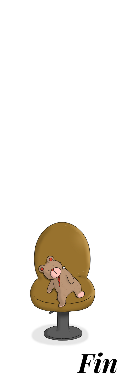 ボロボロになった熊の人形は発達ワイ氏の当たり前のことができず自分自身や、離婚で精神的におられたメンタルを暗喩。首にひもが付いた熊のぬいぐるみと椅子、finはネット民の声を受けて自〇の暗喩。