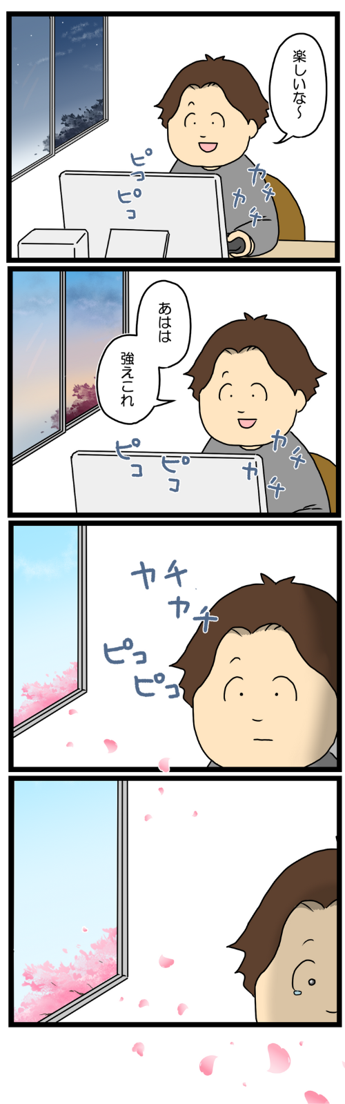 ゲームに打ち込んで離婚を忘れて自分を正当化しようとしたけど、桜の花びらを見て時の移ろいと一緒に昔を思い出して涙にくれる。