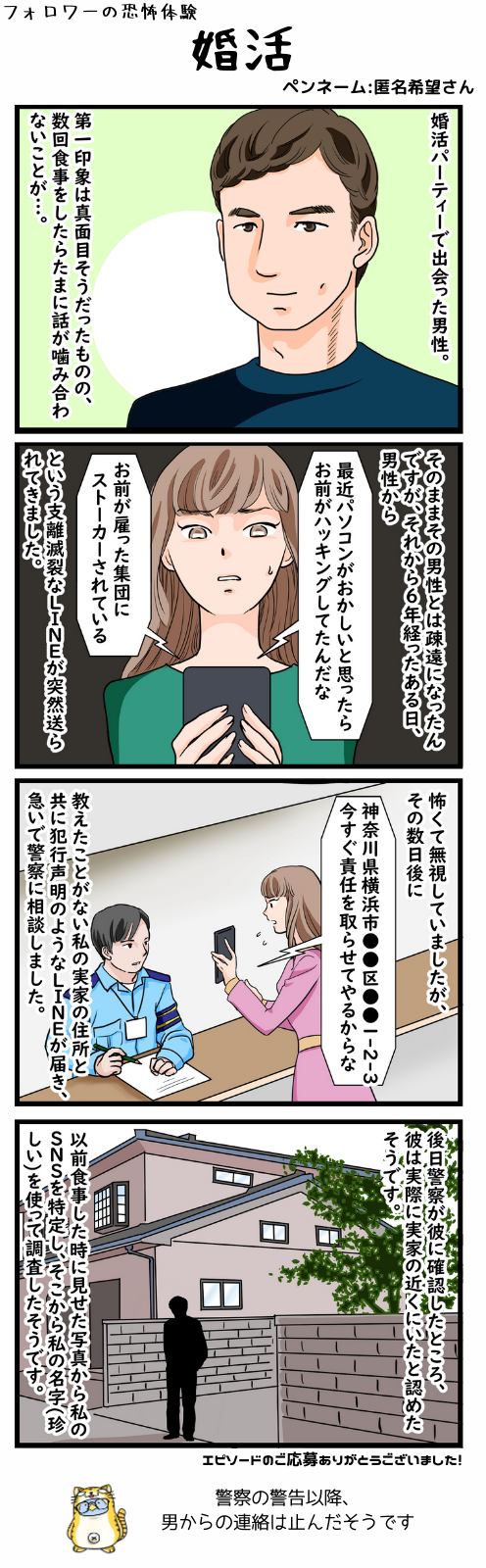 婚活 #フォロワーの恐怖体験 2024/03/06 漫画:えりさく様(Twitter) < 前の記事次の記事 > コメント コメント一覧 (3) 1. ハニー・セイントチャイルド 2024/03/06 12:46 ハッキング、怖いですね… 0 滝沢ガレソ がしました 2. おトクなサービス 2024/03/06 12:50 snsは注意して利用したいと思います 0 滝沢ガレソ がしました 3. パーリナイ 2024/03/06 13:01 固執粘着的ですね…(絵、上手👏) 0 滝沢ガレソ がしました コメントフォーム 名前 コメント 記事の評価 リセット リセット 顔 星 情報を記憶 コメントを投稿する